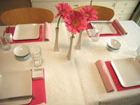 | 今回は、ガーベラの花と同じピンク色のクリアファイルをテーブルマットに使います。クリアファイルの質感がスタイリッシュなイメージをもたらします。 |
