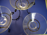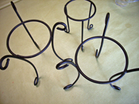 アイアンの花台の上にガラスの花器を置きます。大、小のアイアンで高低をだします。