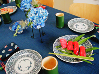 藍染めのテーブルクロスを敷き、あじさいの花を生けて、梅雨のうっとうしさをしばし忘れて、食事を楽しみましょう。