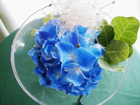 あじさいの青がテーブル空間を涼やかに演出します。花は会話の邪魔にならないように、着席したときの目線より下に生けます。