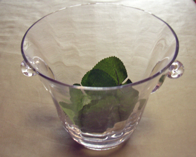 涼やかにみせるために透明のガラス製のワインクーラーを使います。ワインクーラーは、テーブルに置いても違和感がありません。また、口径が広いので、沢山のお花をゆったりと生けることができます。
