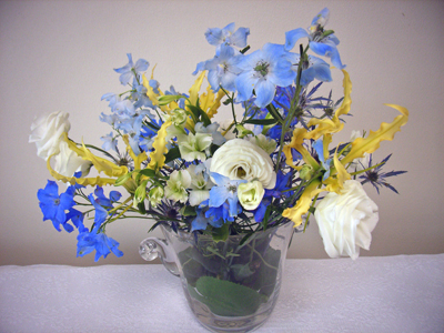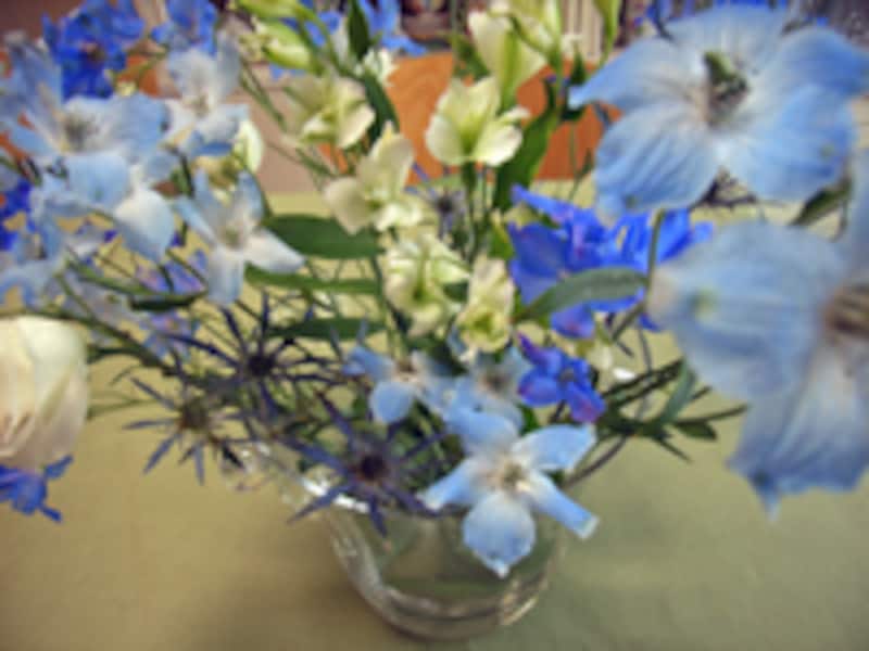 夏のおもてなしは、「涼しさ」がなによりのご馳走です。以下を参考に、涼しそうにみえるビュッフェテーブルの花を生けてみましょう。立っていただくビュッフェの場合は、目線の高さや距離を考え、着席時より花は高めに大きく生けます。![]() |