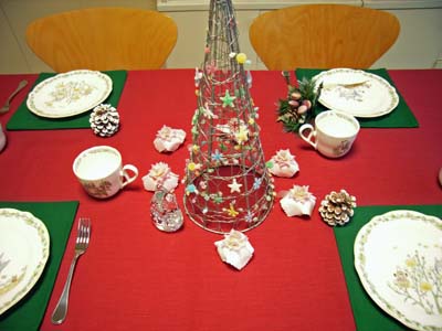 | クリスマスカラーの赤いクロスをテーブルに敷きます。テーブルウェアは「となりのトトロ」です。 (c)NIBARIKI 企画/スタジオジブリ・ノリタケ |