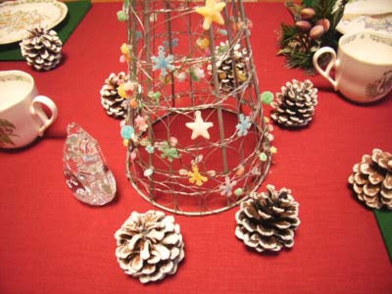 アイアンのネットで編んだ円錐形ツリーに、星型の赤、青、緑、ピンク色のキャンディーを飾り、その周りには、松かさを飾ります。