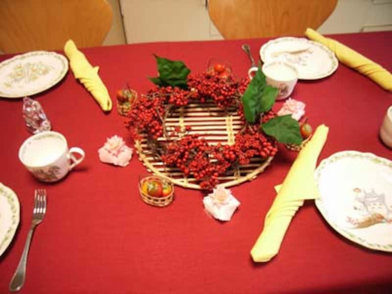 | クリスマスカラーの赤いクロスをテーブルに敷きます。テーブルウェアは「となりのトトロ」です。 (c)NIBARIKI 企画/スタジオジブリ・ノリタケ |