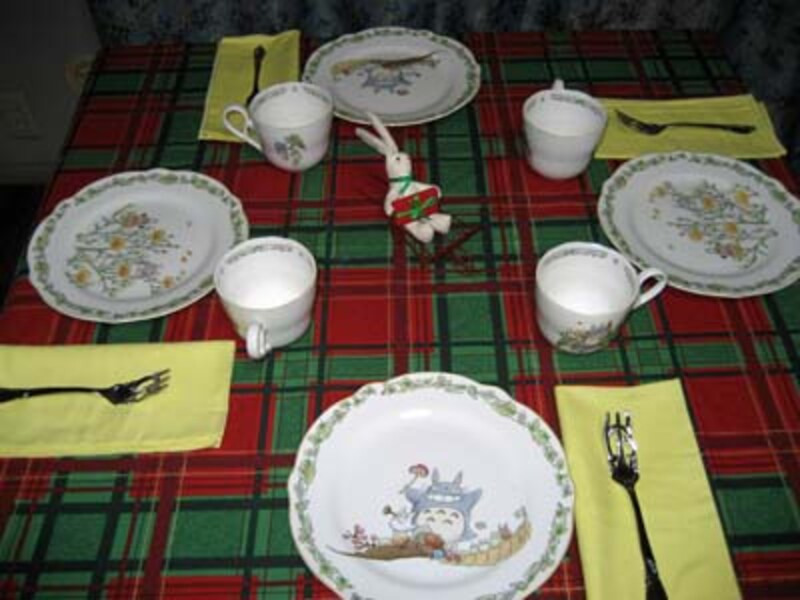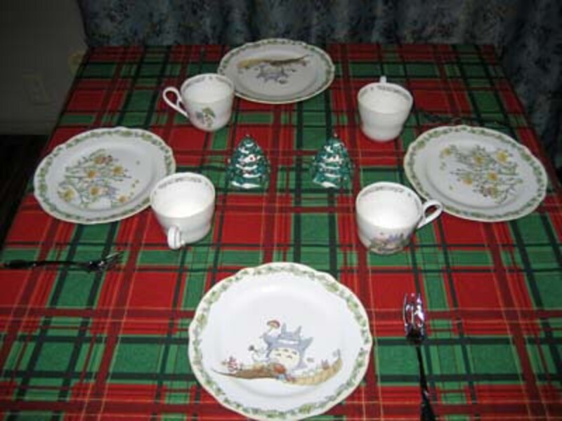 | 赤と緑色のチェックのテーブルクロスを使います。 (c)NIBARIKI 企画/スタジオジブリ・ノリタケ |