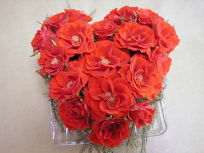 真っ赤なミニバラの花を、ハート型になるようにアレンジします。