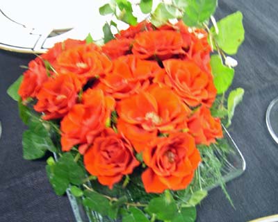 赤い花を使うと、ピンクや白い花より、はっきりとしたイメージが出せます。花材の種類や量が少なくても、以下の画像のようにアレンジすれば食卓の花を楽しめます。![]() |