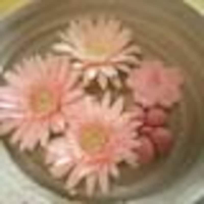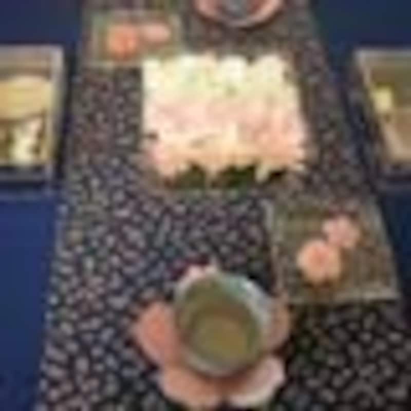 テーブルクロスは鮮やかな赤い色を選びます。白いストック、ピンク色のカーネーションとガーベラの花を、大ぶりの和食器の鉢に生けます。蛸唐草(たこからくさ)文様と木賊(とくさ)文様の染付けのソバ猪口で、ここではコーヒーをいただきます。和と洋の組み合わせの新鮮さをお楽しみください。