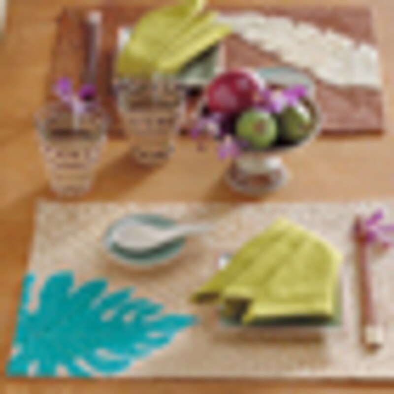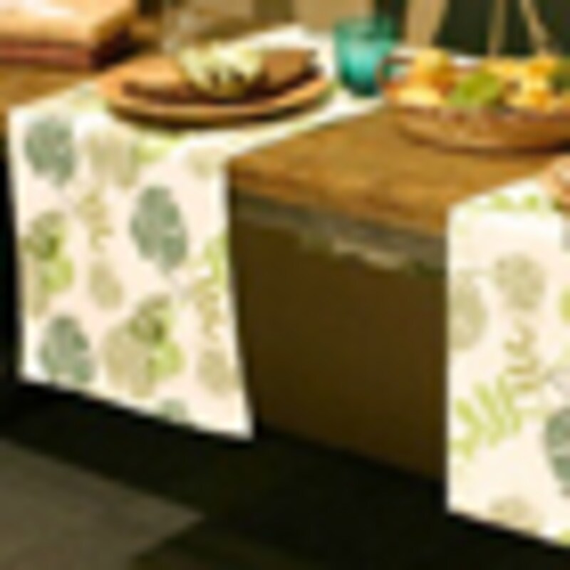 テーブルの横に置かれた、南の島の木々の緑を思わせるインテリアグリーンのモンステラにあわせて、モンステラの葉の柄がプリントされたブリッジランナーをかけます。珊瑚礁にかこまれた南の海の色を思わせるエメラルドグリーンのグラスがポイントカラーになっています。