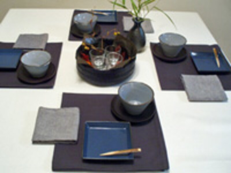 藍色のテーブルクロス、その上に藍染の桜の花文様の和布をブリッジランナーとして敷きます。プラスチックのクリアケースに花を生けセンターに飾ります。