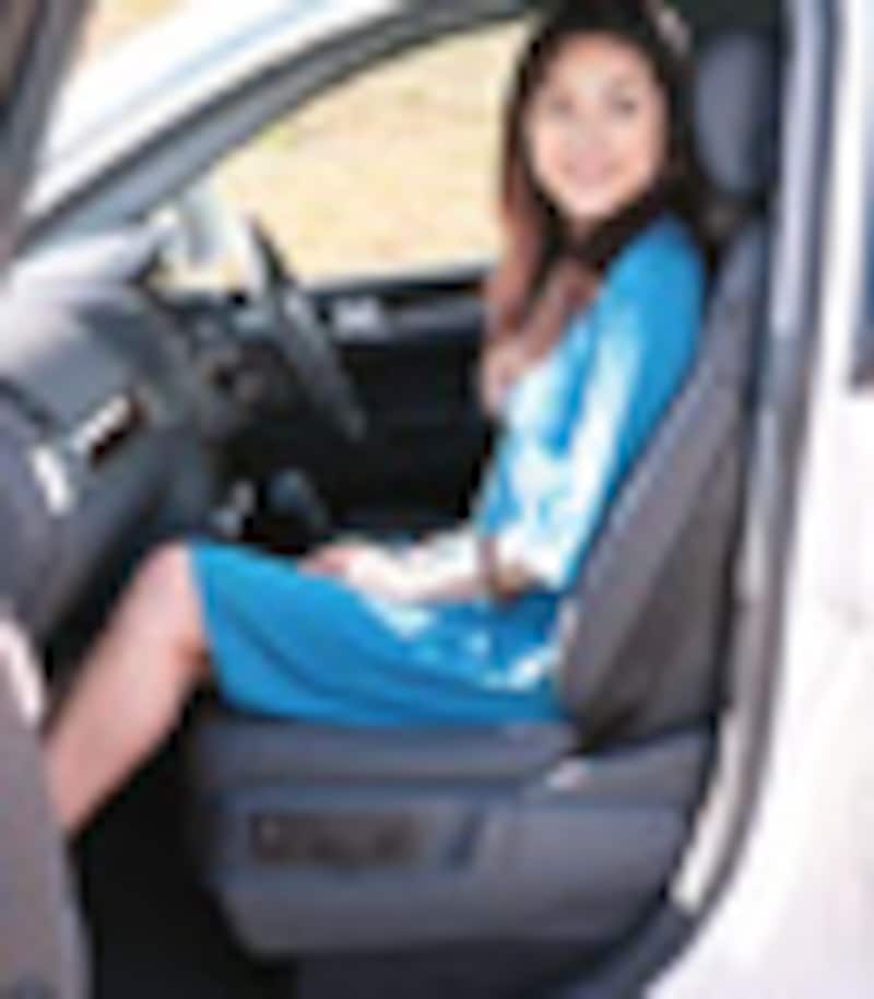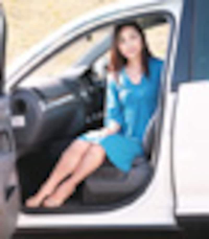 | まずは爪先から車内へ。この時、腹筋の力を抜くと上体が曲がって猫背に……。腹筋を使って上体を上に引き上げる事を意識し、膝を離さないように気をつけましょう。まずは浅い位置に腰掛けます。 |