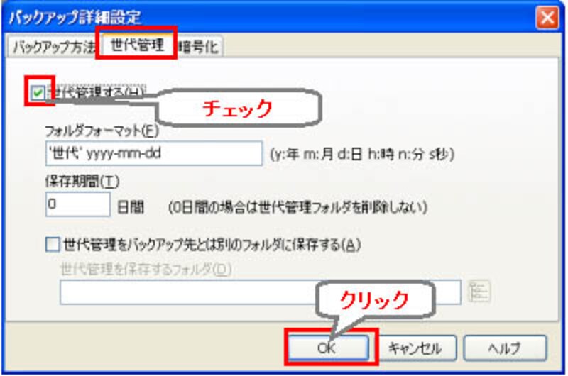 次に、世代管理にチェックをします。チェック後、OKボタンを押して画面を閉じましょう。