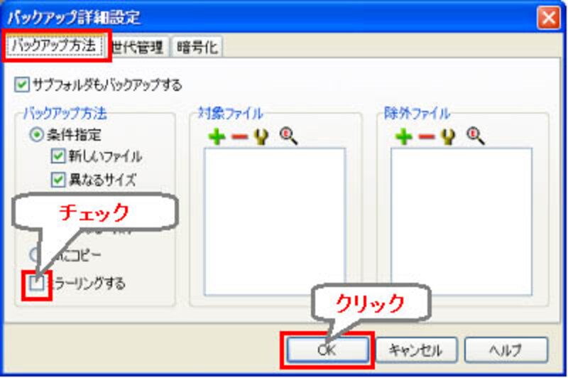 バックアップ方法タブの中にある、ミラーリングにチェックしてください。