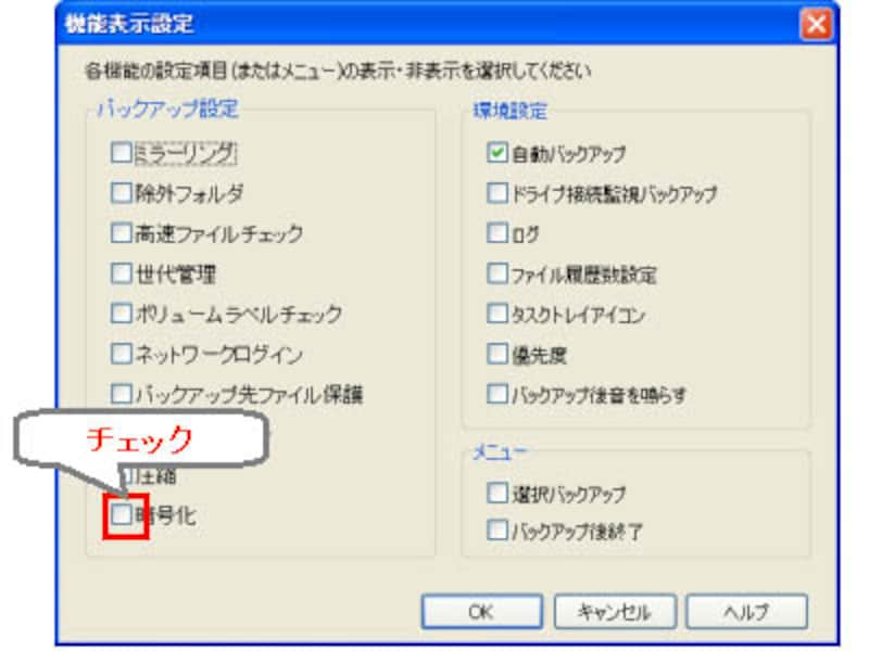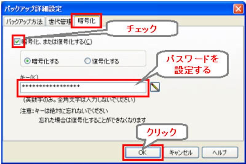 暗号化タブより、以下のように設定を行います。元に戻すには、この設定画面の複合化を選んでバックアップをします。