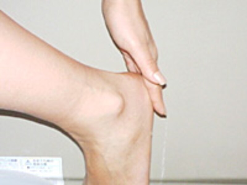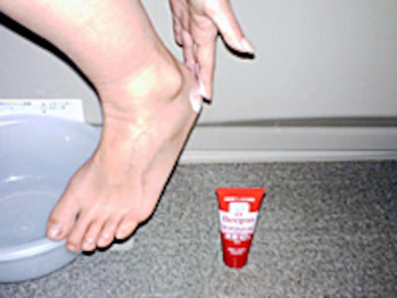2.足を一度お湯からあげて、キューティクルリムーバー(角質軟化剤。薬局などで入手可)をカカトに塗り、5分ほど足を湯につける。