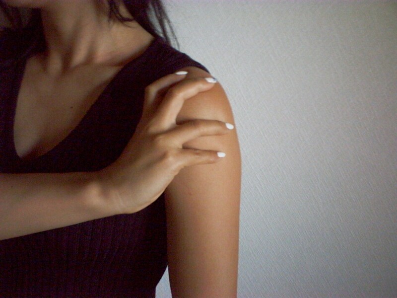 左腋の下は右手で、右腋は左の手で、親指を使って、ゆっくりもみほぐす。