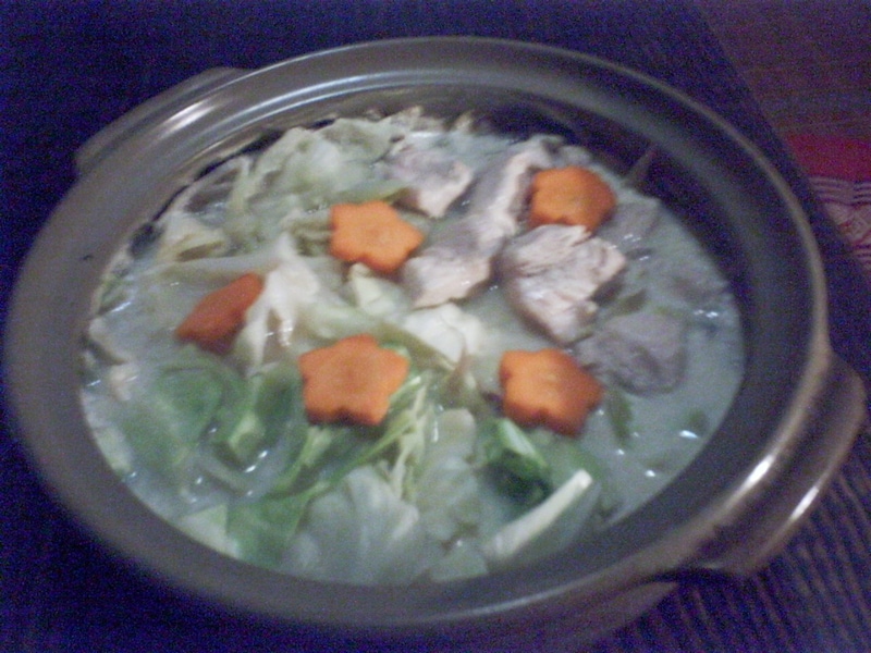 じゃーん、「巨乳育成鍋 鶏肉とキャベツの豆乳鍋仕立て」です。