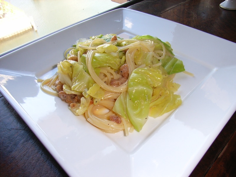 4.ゆであがったパスタ&キャベツをよくからめる。