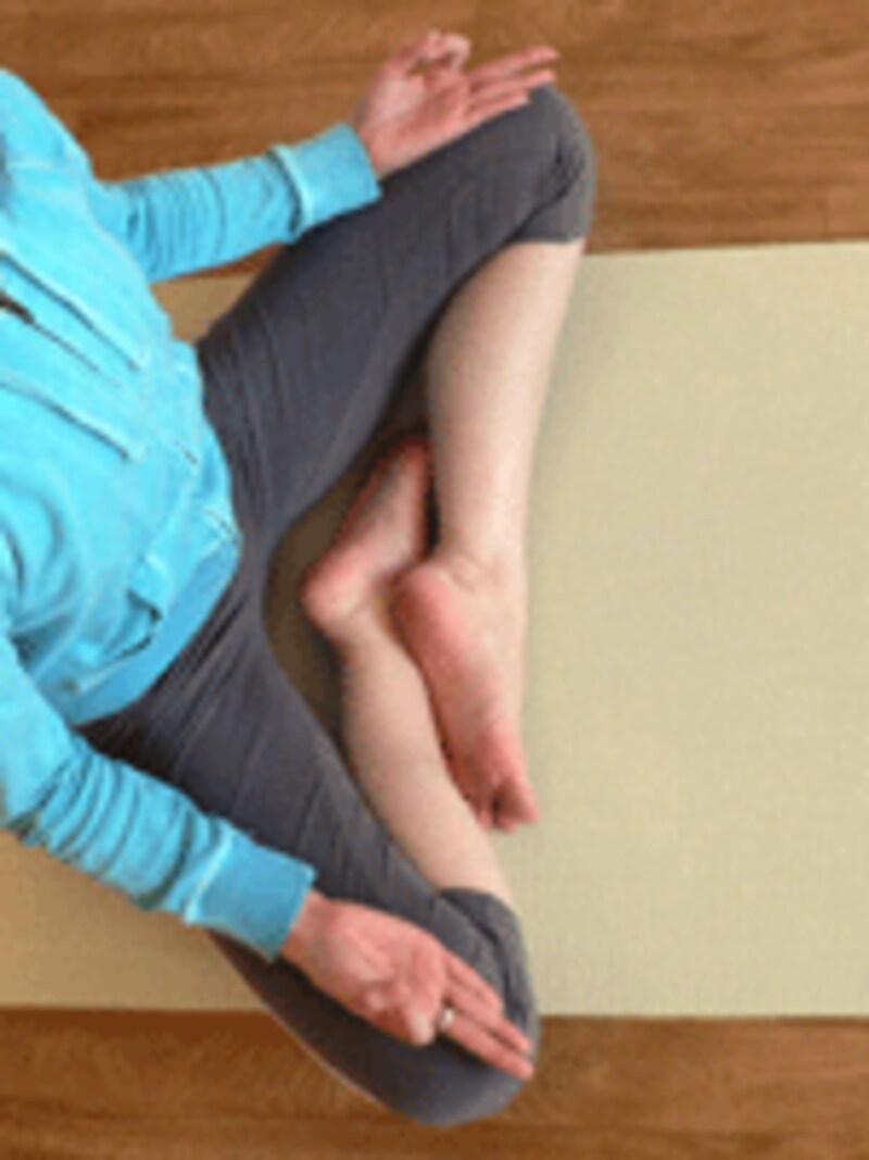 2.曲げやすい方の脚を恥骨に引きつけ、もう一方の脚を曲げた方の足の甲へできるだけ近づけます。手は膝の上で印を結びましょう。