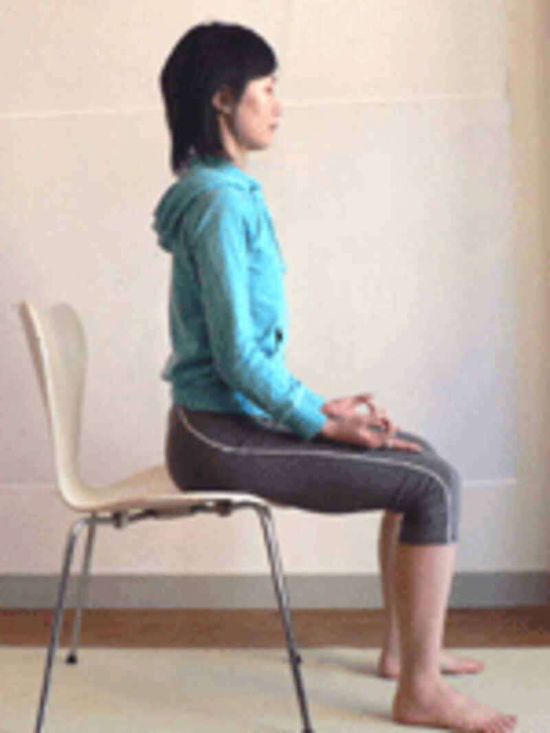 1.両足を床にしっかりと置き、姿勢を正してイスに腰掛けましょう。上体が安定するよう脚は軽く広げ、手は膝の上で印を結びましょう。
