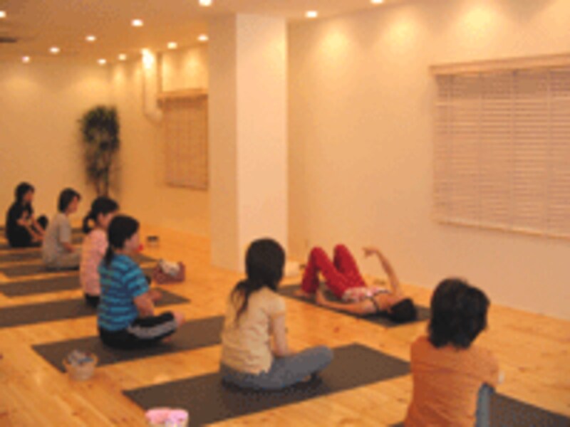 まずは、お腹をへこませながら、横隔膜を使い胸で呼吸する、ピラティス呼吸法から開始。初心者だと、この呼吸法は難しいのですが、筋肉や骨格の動き一つ一つを優しく丁寧に指導してくれるので、皆さんとっても楽しそう。