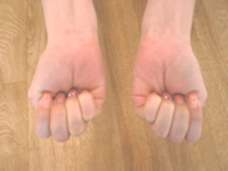 手のひら側を下にして軽く握り、両手をももの付け根に入れましょう。
