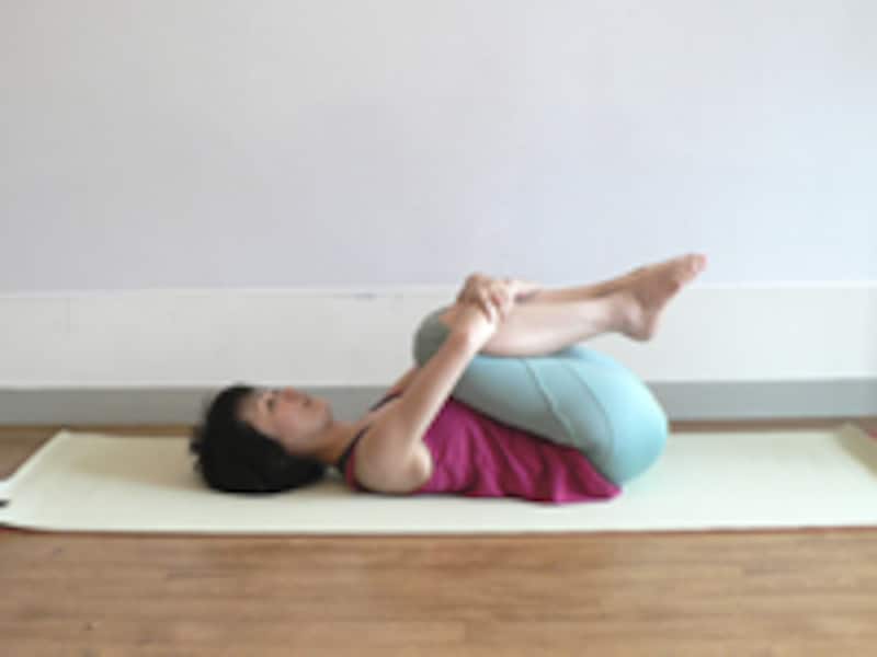 仰向けの姿勢から、両手で両ひざを抱えます。両ひざを胸に近づけ深呼吸です。