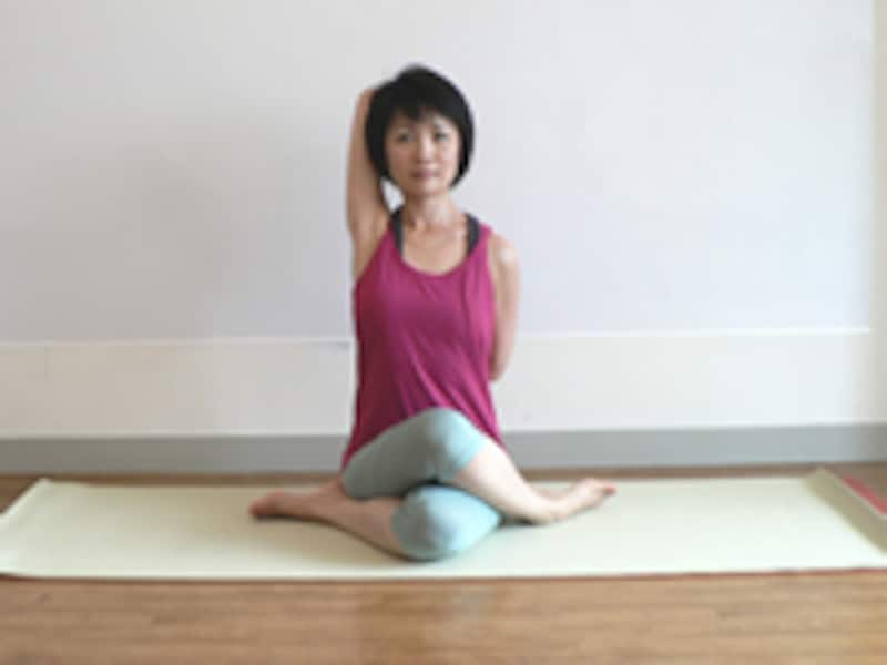 姿勢改善におすすめなのは、牛の顔のポーズ。ゆっくりと深呼吸を繰り返し、リラックスして行いましょう。はじめは背筋を伸ばすのが難しくても、毎日10秒続けることで、シャキっとした姿勢に!体が硬い人はタオルを用意して。