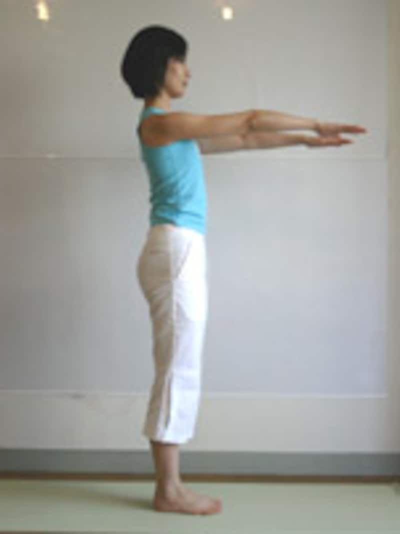 背筋をまっすぐに伸ばし、片足だけに体重がかからないよう両足で立つ。