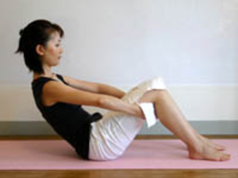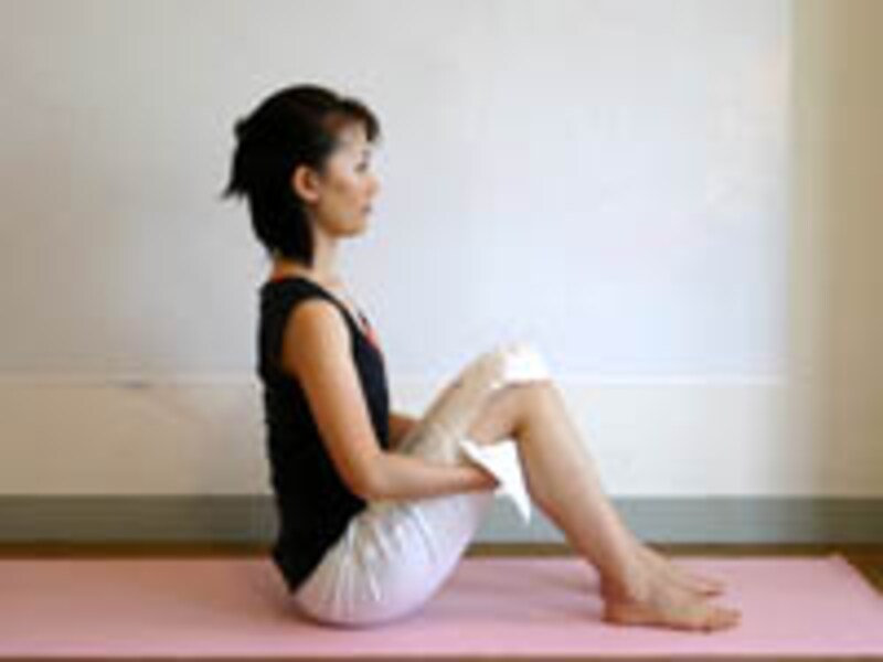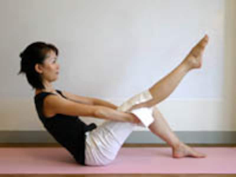 つま先まで脚を伸ばしたまま<息を吸い>