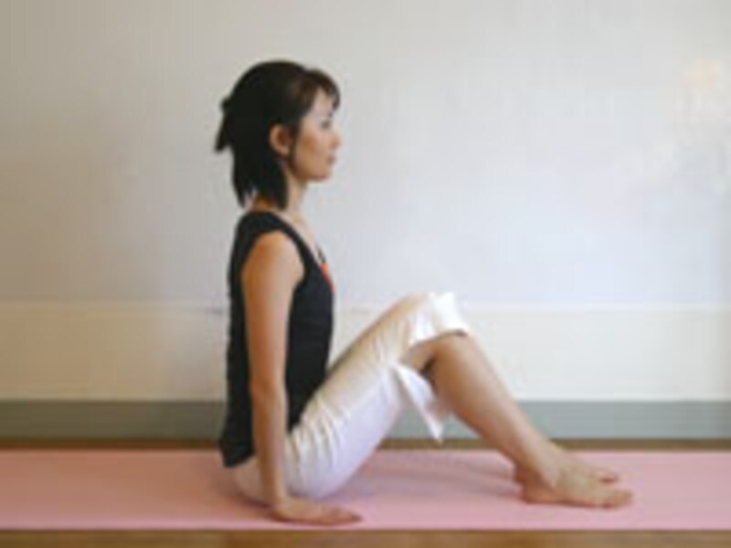 <吸いながら>上体を正面に戻し、脚を入れ替え、反対側も同様に行います。