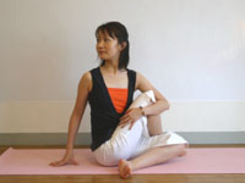 <息を吐きながら>上体を右へねじる。アゴが肩の上に乗るように首も少しずつねじります。この姿勢で5呼吸繰り返す。