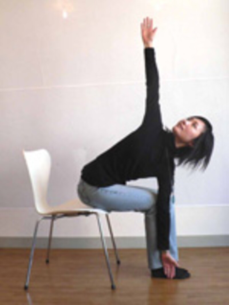 1,2時間ずっと同じ姿勢でいると、血液の循環があっというまに悪くなります。そんな時は『イスを使った三角のポーズ』を行うと肩と腰周りがスッキリ!![]() |