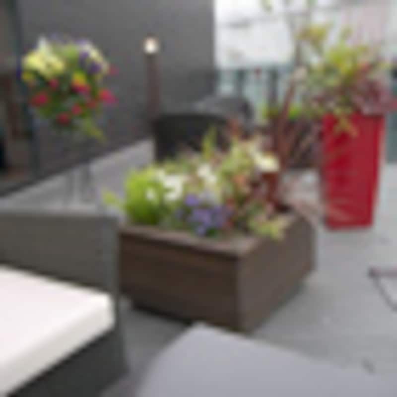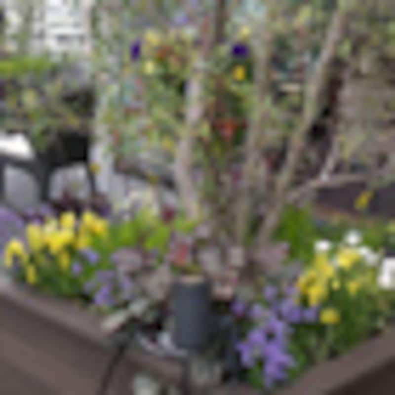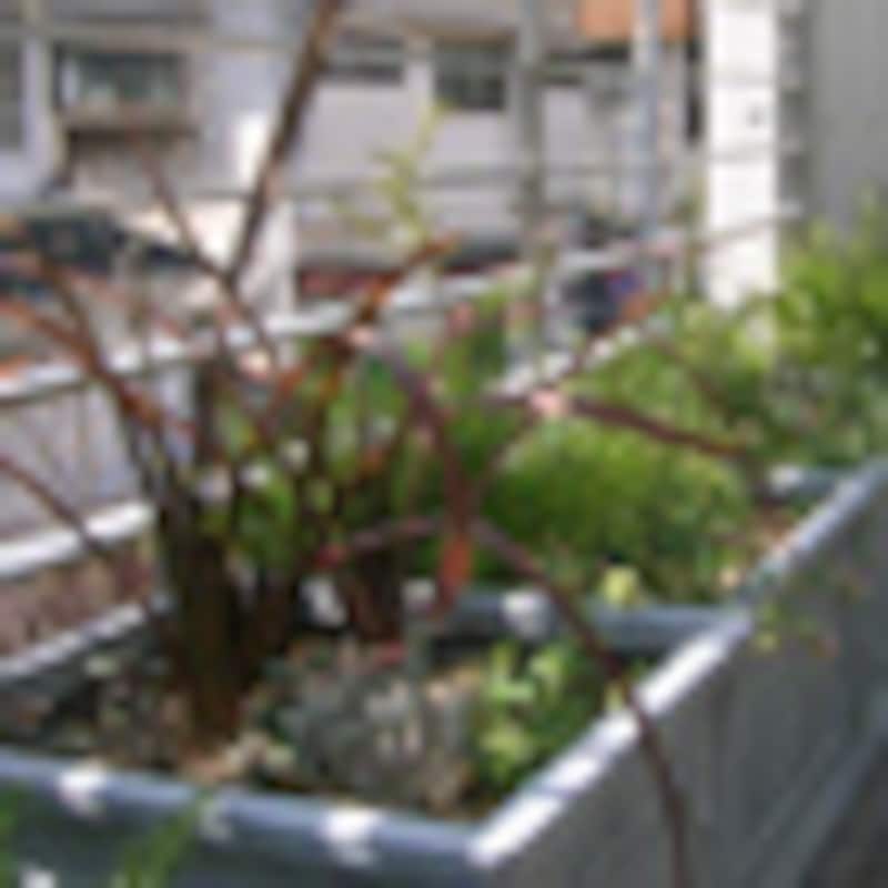 奥に見える一番大きなプランターには、小豆島出身の奥さまのリクエストにこたえて、シンボルツリーのオリーブを植えました。