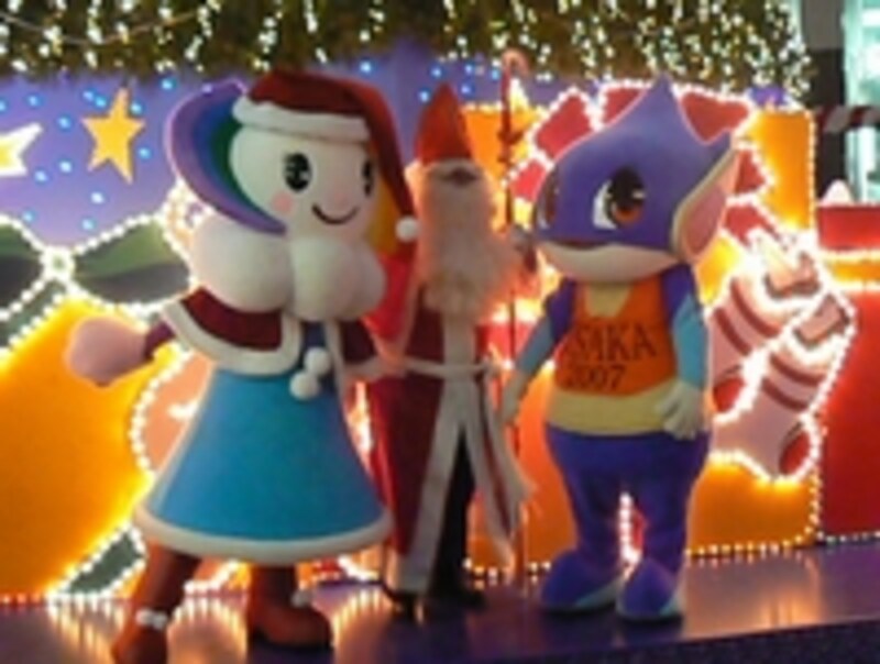 | 空中庭園展望台マスコットの「そらら」と「ニコラウス」、IAAF世界陸上2007大阪の公式マスコット「ドラッフィー」も登場してドイツ・クリスマスマーケットを盛り上げます |