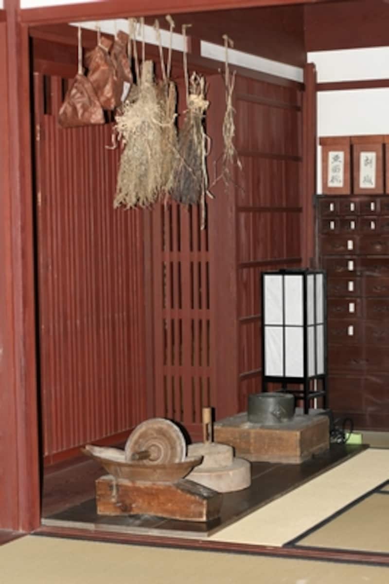 | 薬屋内部です。薬を調合するための石臼、薬研などが置かれ、天井には漢方薬が釣られています。 |