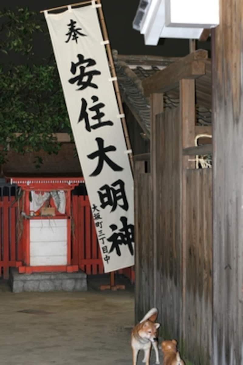 | 路地裏に入ると突如として「安住大明神」の幟と祠が見えます。犬が2匹じゃれあっているのも可愛らしい。 |