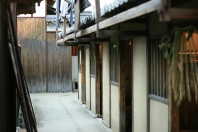 | 町屋の裏路地には長屋が連ねています。時代劇などでもおなじみの光景です。 |