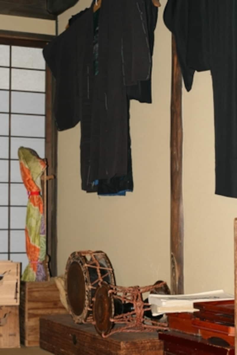 | 長屋内部です。羽織に太鼓や堤太鼓が置かれていますが、これは「義太夫節のお師匠さんが暮らしている」という設定だそうです。 |