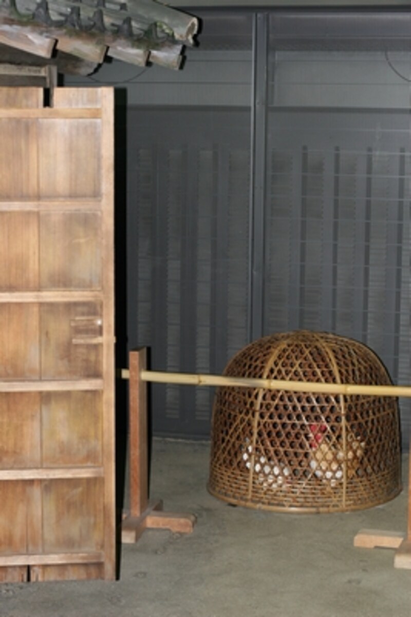 | 長屋の共同井戸と共同便所近くにはひっそりとニワトリのオブジェも。今晩のおかずなのでしょうか。 |