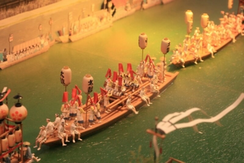 | 8階「モダン大阪パノラマ遊覧」フロアより。天神祭の花形ともいうべき願人と催太鼓の船渡御の模型です。展示ボタンを押すと勇ましい祭囃子が聞こえたり、夕刻、夜の天神祭の風景に切り替わったりします。 |