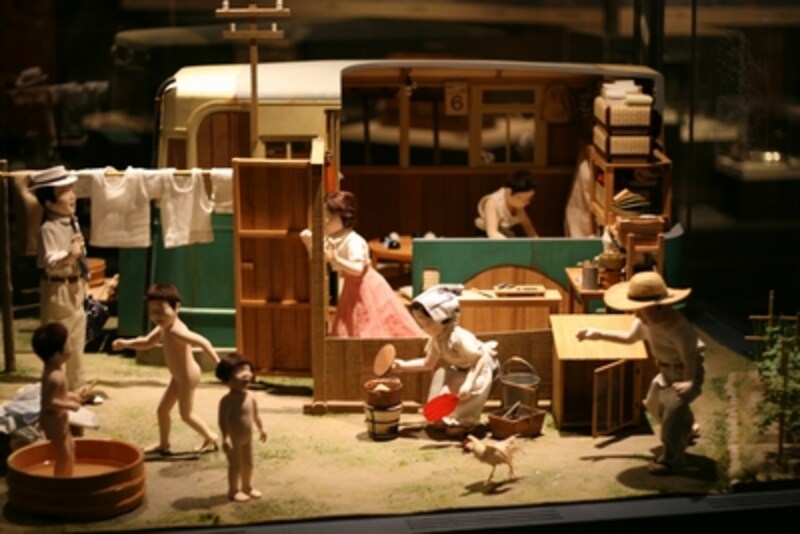 | 仮設のバス住宅です。終戦直後、焼野原となった大阪では公共バスを開放してこのように仮設住宅として使用していた時代があったそうです。ちなみに中央で玄関をあけている女性が「住まい劇場」の主人公「悦子さん」です。 |