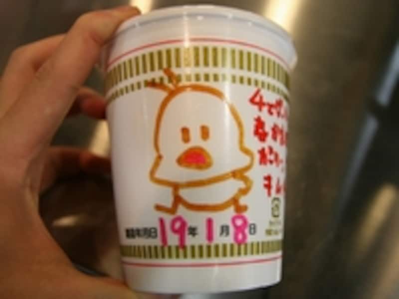 まずは自動販売機でマイカップヌードル(300円)を購入します。出てくる容器はカラッポで何のスープも具材も入っていませんが、すかさずスタッフの方がカップにフタをしてテーブルに案内してくれます。そして「備え付けのマジックで製造年月日やお好きな絵やデザイン、スープ1種類と、具材4種類を記載してください」と促されます。