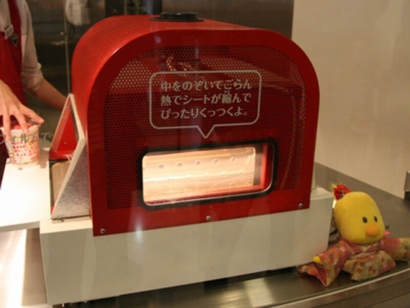 | シュリンクで梱包される様子も覗ける仕組みになっています。お正月仕様で晴れ着姿のひよこちゃんにも注目です。 |