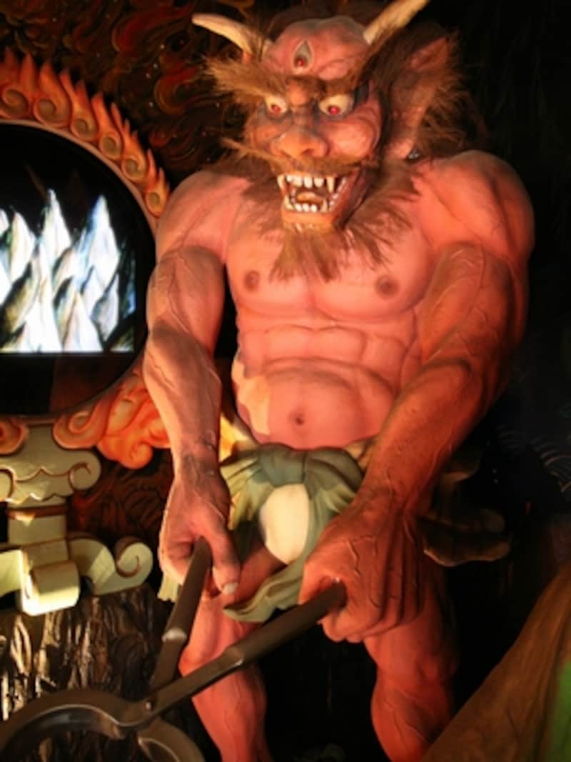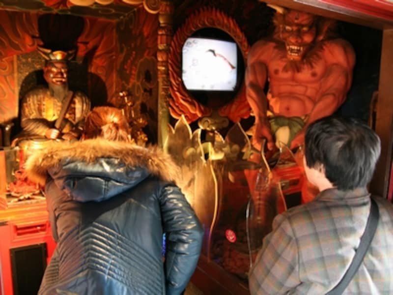 | 地獄堂内部の別ショット。閻魔大王と鬼のあいだにあるのが「浄玻璃の鏡」です。死者の生前の行いを映し出す鏡とされていますが地獄堂ではボタンを押して地獄絵図のビデオ映像を再生するモニターとなっています。 |