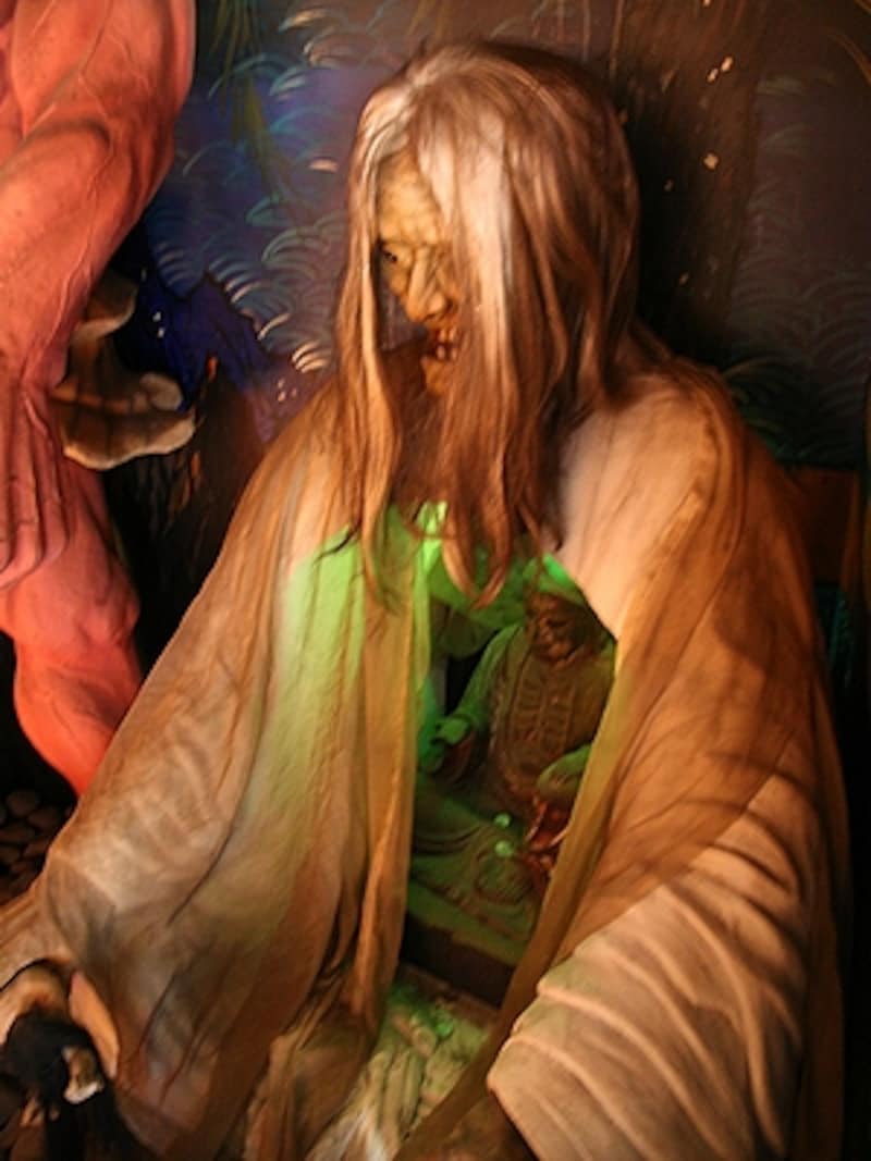 | こちらは奪衣婆です。死者の衣を剥いで、その重さで罪科を測るとされています。胎内に「座禅を組んでいる高僧」が見えますが、これは「恐ろしい奪衣婆も実は慈悲深い仏である」というのを意味しているのでしょう。 |