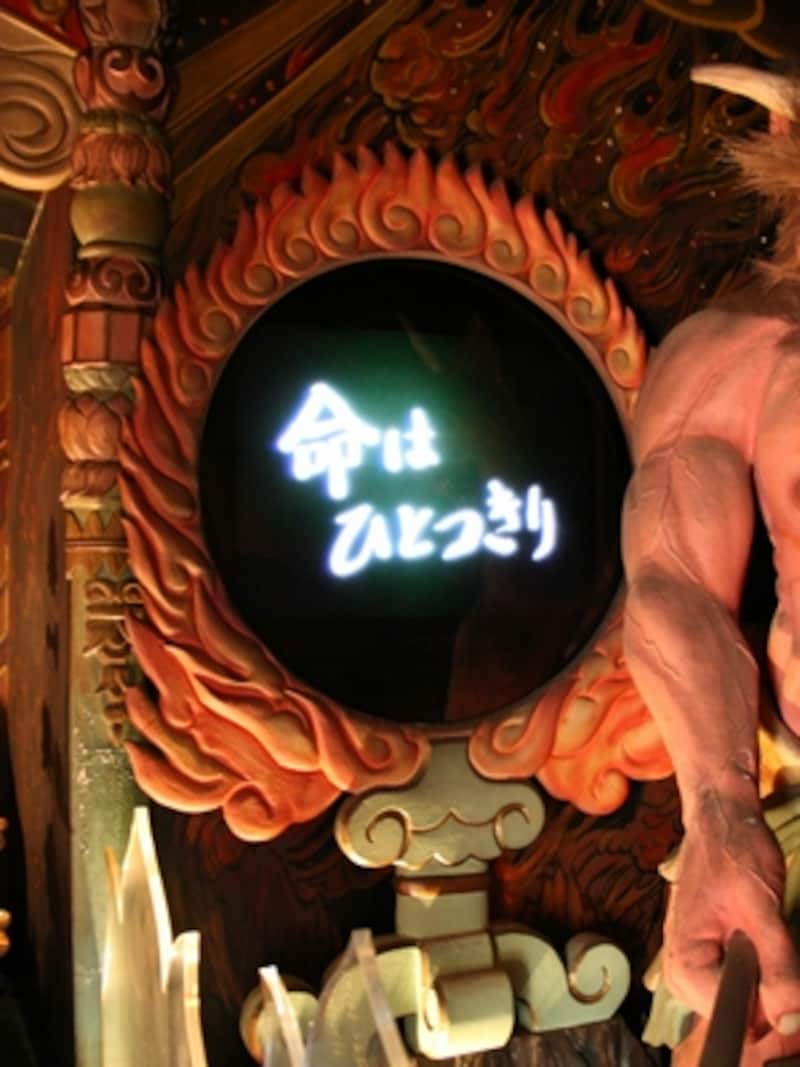 | 地獄絵図のビデオ映像の最後に流される「命はひとつきり」というメッセージ。昨今の殺伐としたニュース事件などを鑑みると、この「地獄堂」の生命を肯定するメッセージには深い含蓄を感じます。 |