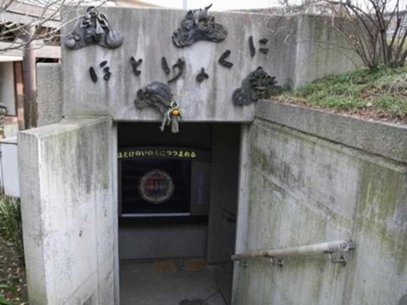 | 「ほとけのくに」の入口です。手すりの中に四国八十八ヶ所霊場の砂が入っています。ここを訪問するだけで四国八十八ヶ所霊場を巡ったのと同じだけの功徳が得られるというわけです。 |