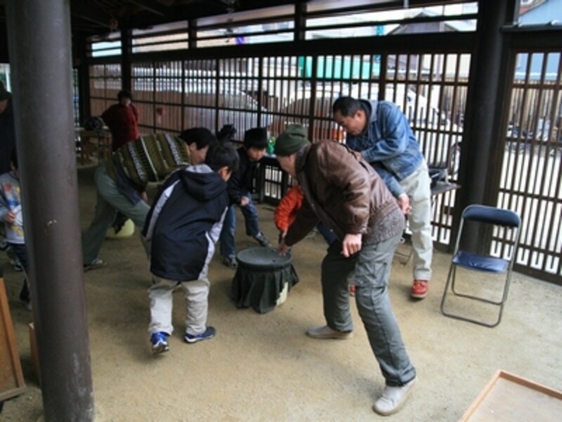| 「遊び縁日」のバイゴマ(関東風にいえばベーゴマ)です。紐の巻き方やコマの廻し方などもちゃんとレクチャーしてくれますので、家族みなさんで挑戦してみてください。 |